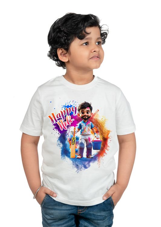 Chombooka Boys & Girls' Colorful Polyester Holi Printed T-Shirt | Festive Fun for Kids | Happy Holi Cricket Theme Printed Tee | Set of 1