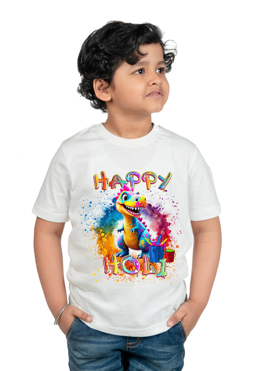 Chombooka Boys & Girls' Colorful Polyester Holi Printed T-Shirt | Festive Fun for Kids | Happy Holi Dinasaur theme Printed Tee