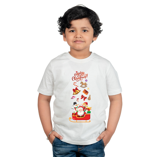 Christmas Santa Sleigh & Gifts Print | Merry Christmas Half Sleeve Cotton Tshirt for Boys & Girls | Winter Holiday Outfit